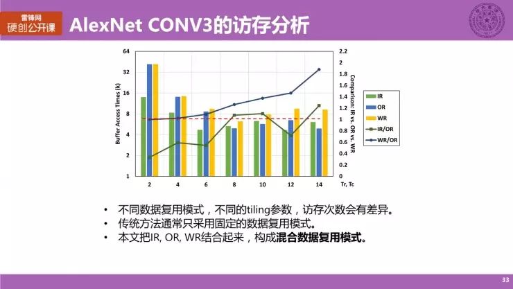 我们这里做一个简单的分析,用 AlexNet 的 CONV3 做一个访存次数的分析。我直接给了一个分析的图,这里简单解释一下,横坐标是 Tiling 的参数,左边纵坐标是片上 buffer 的总次数,而三个颜色的柱子分别对应的是 IR、OR 与 WR,表示它们在不同的 Tiling 参数的访存次数,为了方便我们直接来看比较结果。