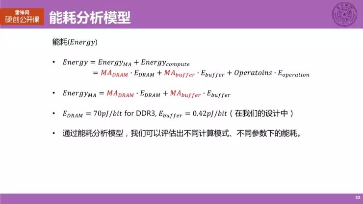 在我们的设计中,对于 DDR3 的,因为每个 Dram 的单位访存能耗是 70pj/bit,而片上 buffer 的单位访存能耗是 0.42pj/bit。我们其实对访存能耗式子中的每一个项都做了非常精确的一个刻画,那么,我们通过一个能效的分析模型就可以评估出不同的计算模式,在不同的参数上面它的能耗是多大,这样就能我们的优化目标挂钩了。
