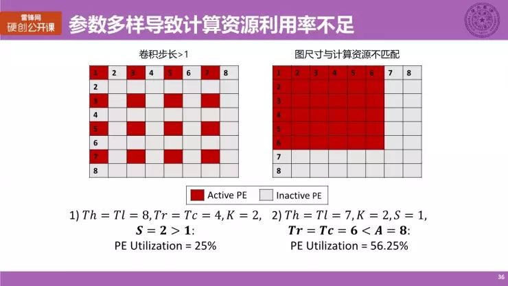 第二点,从我们计算的图的尺寸,特别是 Output Map 的尺寸,它会与计算资源的规模以及形态会不匹配,具体来说,如果要计算一个 6×6 的一个图,但是我的阵列大小是 8×8。显而易见的,只有 6×6 部分他做了有效的计算,而其余的边缘部分并没有做有效的阶段,甚至直接没有用。这样的话,我们计算出来的利用率仅仅只有 56.25,将近一半的计算资源没有用上,实在太可惜了。