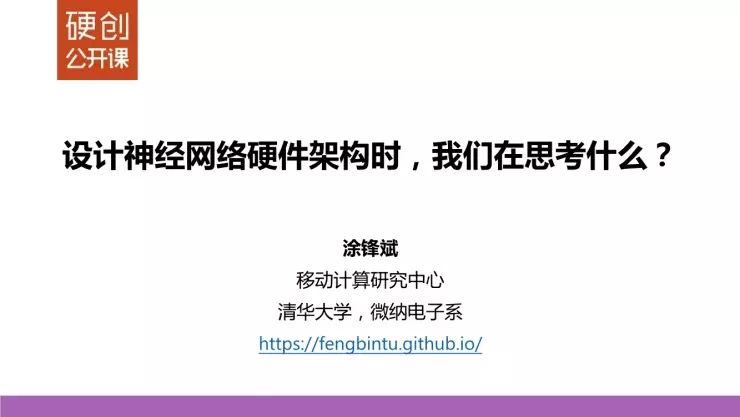 各位观众晚上好,我是来自清华大学的涂锋斌,今天非常荣幸收到雷锋网 AI 科技评论的邀请,在此给大家做一节硬创公开课,主题是《设计神经网络硬件架构时,我们在思考什么?》