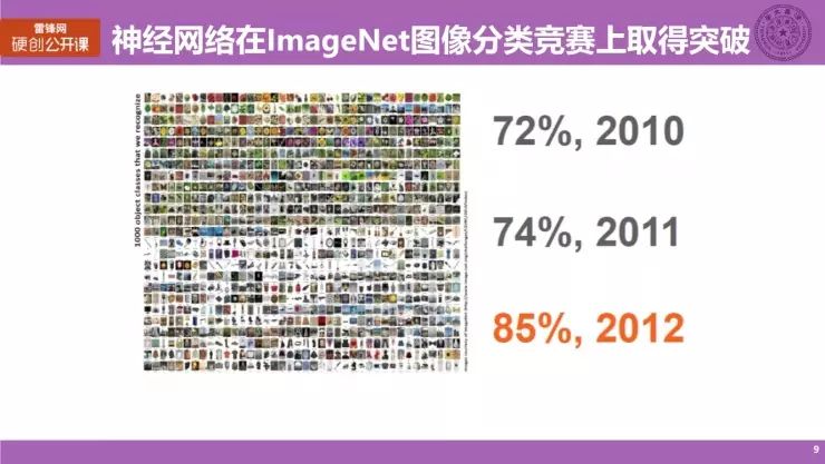 在 2012 年,神经网络 AlexNet 在 ImageNet 图像分类竞赛上取得突破,获得了 85% 的准确率,相较于之前最好的识别率提升了 10% 以上。这是一个非常大的突破,在当时引起了非常广泛的关注。而现在,每年举办的 ImageNet 的识别精确度已经超过了 95%,已经超过人类识别图片的能力。这是一个非常惊人的结果。直至今年,每年拔得头筹的团队都是采用神经网络。
