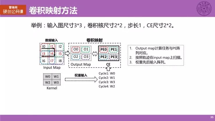 第三点,对于权重来说,它紧跟着输入数据的节拍,先后输入阵列,整体的过程就是卷积映射的方法,这个方法是一个非常经典的、大家通常会使用的方法。在现有很多的当前的工作中都采用类似的一些方法,比方说像一些利用阵列形式计算的硬件架构都会通常采取类似的方法,当然在细节上会稍许的不同,不过基本上的原理是类似的。