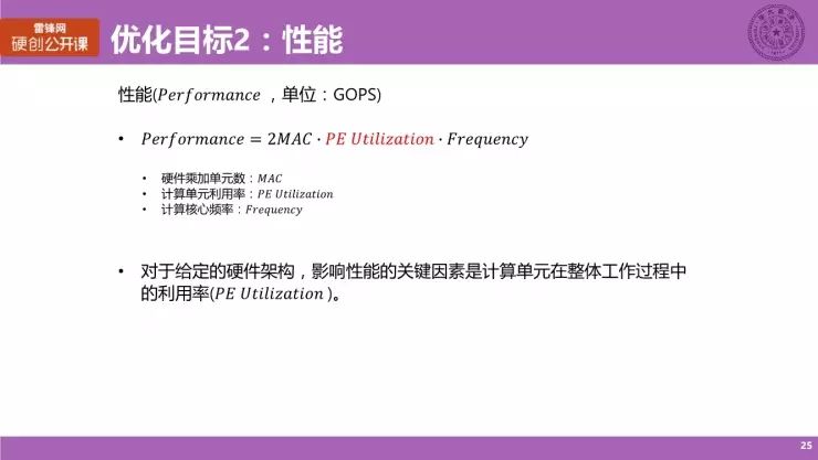 第三项是计算核心的频率(Frequency),硬件在工作的时候会有一个计算的频率,频率的高低会直接影响到总的性能高低。如果硬件乘加单元数越高,利用率高,计算核心频率高,那么我的总性能肯定是越好的;而对于一个给定的一个硬件架构,影响它的性能的关键因素就是计算单元,在整体的计算工作过程当中,它的利用率是高还是低,PE 越高,它的性能就会越高,这是我们的一个观点。