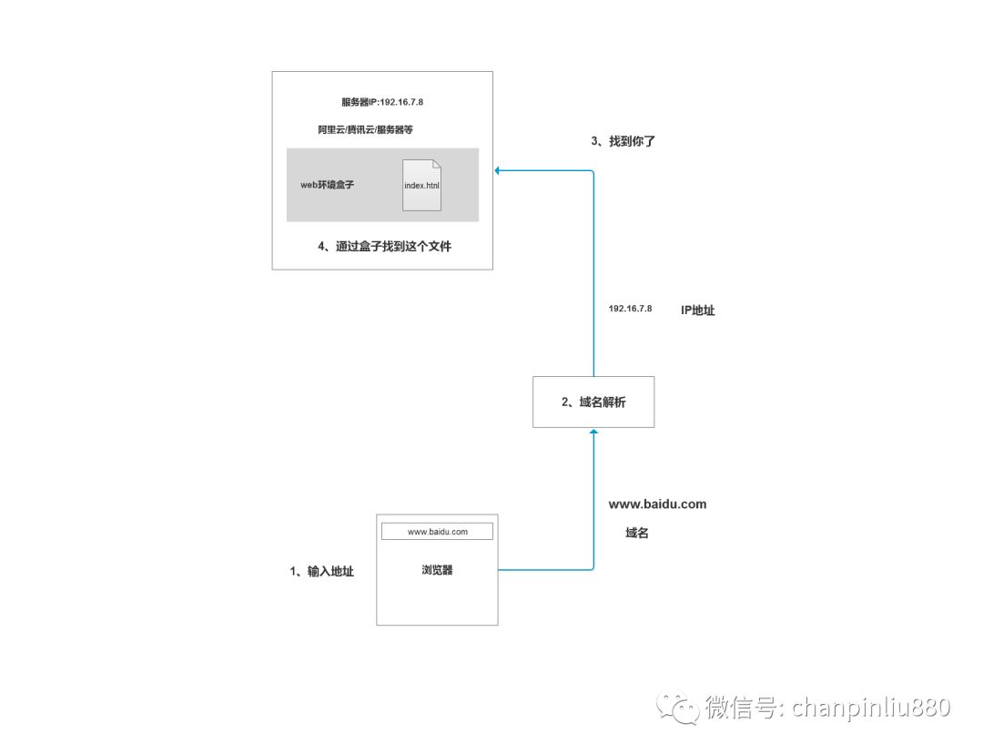 通常浏览器访问的网页被称为web页,每一个web页都有一个唯一的地址,不同的地址组合在一起,通过链接之间相互跳转,最终形成一个网站系统,我们使用的各种网站,需要通过网站的域名进入,所谓的域名就是每一个网站的唯一地址,例如百度的域名是:“baidu.com”,当我们在浏览器里面输入www.baidu.com,这个域名的时候,通过域名解析器,将域名解析成IP地址,通过这个IP地址找到服务器的IP,找到服务器以后,就会在服务起里面找到相关的文件,如下图(看不清可点击放大查看):