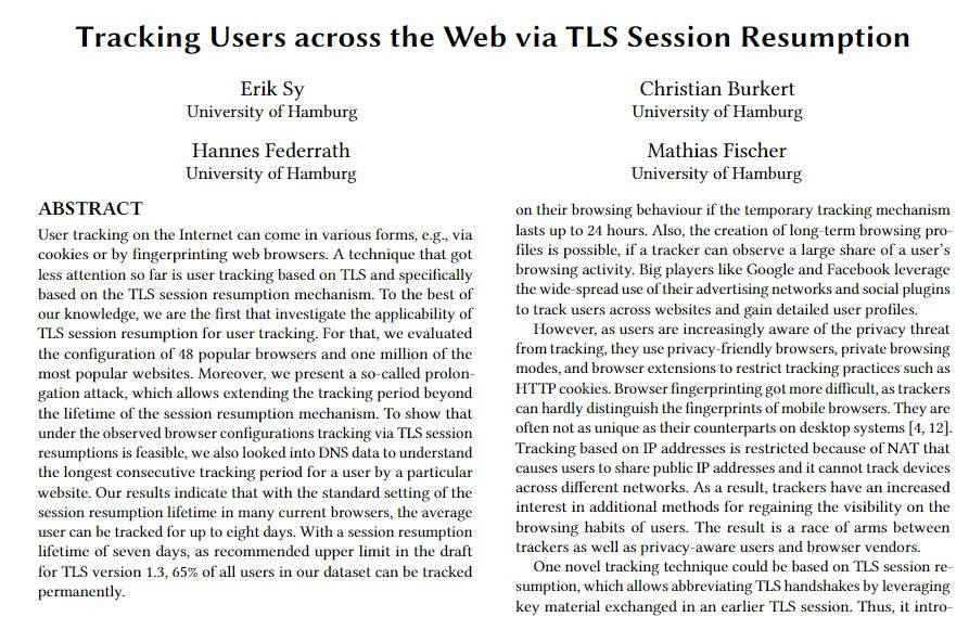 目前网站追踪用户的手段,比较流行的仍然是 Cookie 或通过网页浏览器特征进行辨识,而较少受到关注的技术是基于传输层安全协议(Transport Layer Security,TLS)的用户跟踪,特别是使用 TLS 对话恢复(TLS Session Resumption)机制,而汉堡大学研究员率先对 TLS 对话恢复机制的适用性进行了研究。