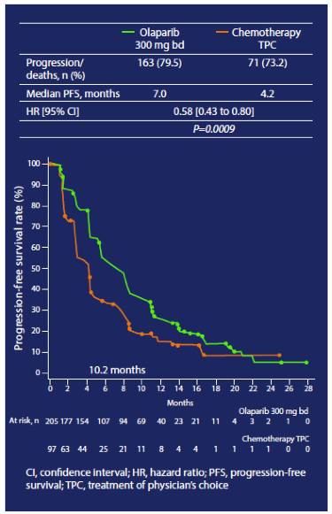 关于HER2-转移性乳腺癌,2017年ASCO会议公布了几项重要临床试验成果。III期OlympiAD研究中,302名携带胚系BRCA基因突变的乳腺癌患者随机接受标准化疗或多聚酶抑制剂(PARP)olaparib6,结果显示与化疗相比,olaparib可显著改善中位PFS(4.0mvs7.2m)(HR, 0.58; 95% CI, 0.43–0.80; p=0.0009)(图1),而且≧3级不良事件发生率更低,生存质量更佳。
