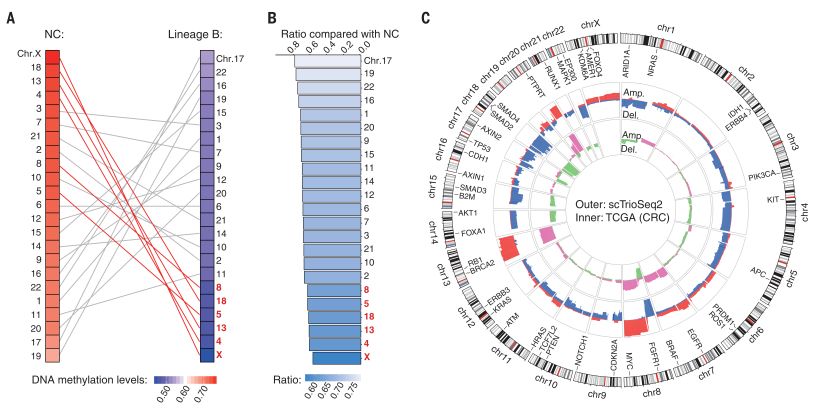 利用新的scTrio-seq2方法,研究人员对来自12例结直肠癌患者的1800多个单细胞进行了多组学测序。同时,研究人员采集了10例患者的原发肿瘤和转移肿瘤的样本,并获得了与这10例患者匹配的原发和转移数据。通过分析测序数据,研究人员就能够识别每位患者克隆突变产生的遗传谱系,并与基因表达、拷贝数变异和甲基化数据联系起来,以跟踪肿瘤是如何演化成转移性肿瘤的。此外,从肿瘤的多个区域取样也有助于分析识别瘤内异质性。