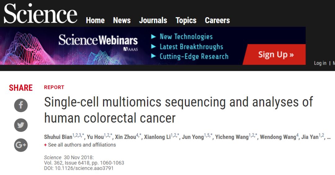 为了更好地了解结直肠癌的发生与转移,北京未来基因诊断高精尖创新中心汤富酬研究组,与北京大学第三医院乔杰研究组、付卫研究组联合开发了一种单细胞多组学测序方法,可同步分析拷贝数、DNA甲基化和单细胞的基因表达。利用该方法,研究团队首次在单细胞分辨率、多组学水平解析了人类结直肠癌在发生和转移过程中,基因组拷贝数变异、DNA甲基化异常及基因表达改变的特点及相互关系。11月30日,该研究成果发表在Science上,文章题为“Single-cell multiomics sequencing and analyses of human colorectal cancer”。