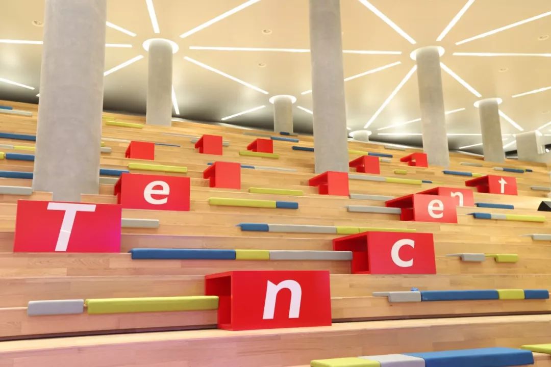 腾讯北京总部大楼采用方形建筑,底部切角分别界定了员工、贵宾、访客的入口位置。具有180米x180米、单层2.2万平方米的超大平面中,设置有两个室外庭院、三个室内中庭。腾讯该建筑标准办公层层高4950mm,工位上方采用镂空式吊顶,通过扁宽梁设计及机电管线优化,净高实现3300-3500mm之间。