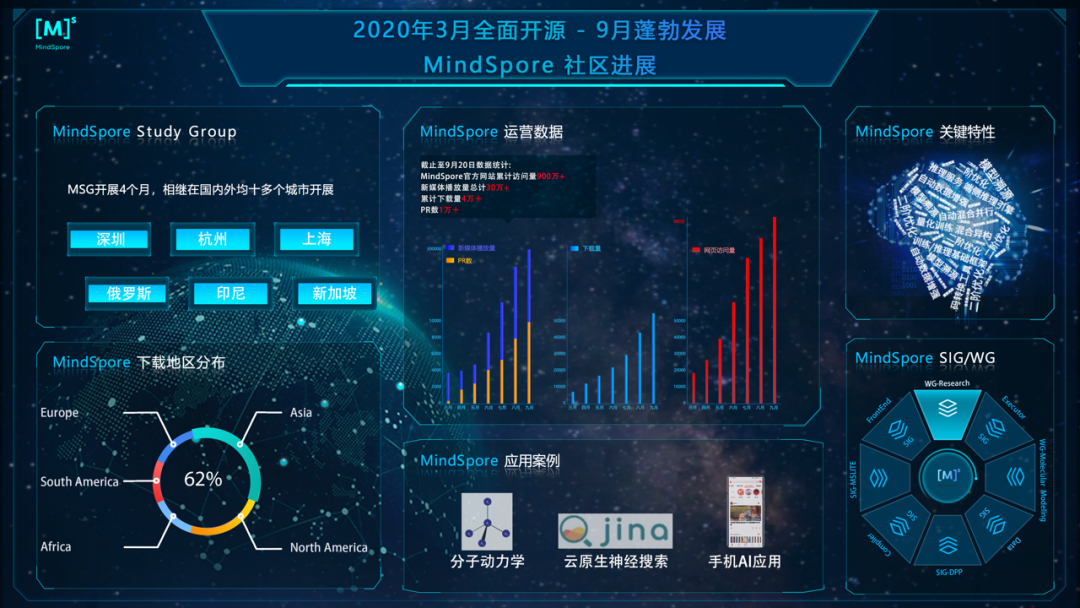收获了4.5w+名开发者,累计PR数1w+,下载使用用户遍布全球,覆盖亚洲、欧洲、南美、北美、非洲、等各地区,MindSpore Study Group(下简称MSG)启动4个月便在海内外多个城市顺利开展,深圳、杭州、苏州、上海、俄罗斯、新加坡、印尼均已建立MSG组织,做到了真正的全球化社区。
