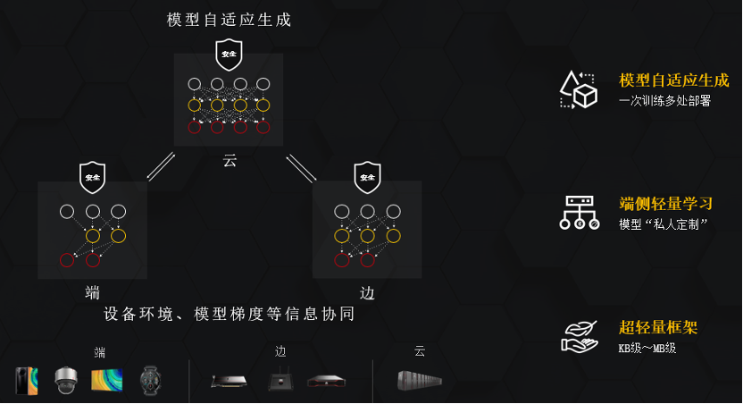 MindSpore 1.0提供模型自适应生成能力,通过平衡模型精度和设备资源约束,自动搜索匹配的模型,开发者只需要做一次训练,得到的模型就可以在端、边、云等多处部署,可保证生成的精度损失小于1%;对于已经部署的模型,MindSpore提供了轻量化的端侧学习能力,发挥私人数据的价值,持续提升模型精度,让智能设备越用越懂你。
