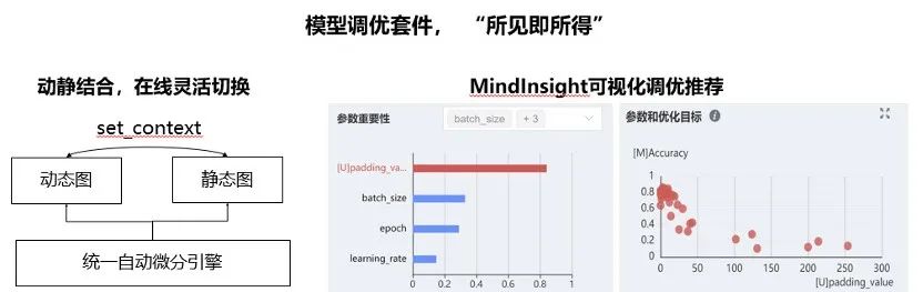 1.0版本中,MindSpore提供了所见即所得的模型开发和调优套件。在模型开发阶段,MindSpore基于统一的自动微分引擎,支持用户用一行代码切换动态图和静态图模式,使得兼顾开发效率和执行效率。在模型调优阶段,MindInsight可视化调优工具帮助用户汇总和分析调优过程,并且向推荐合理的调优策略,加速模型调优过程。