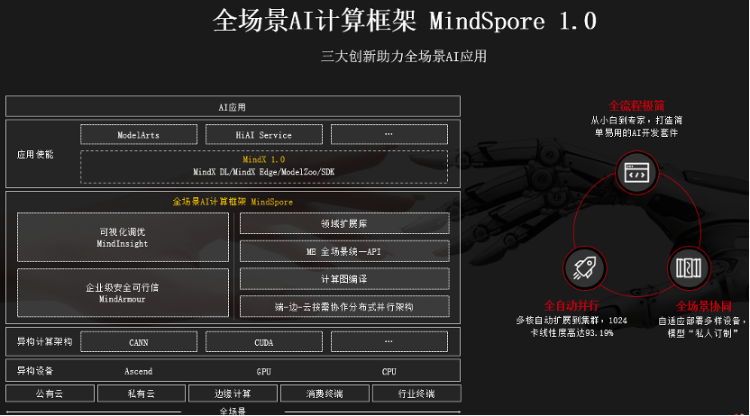 在框架方面,为了多样化设备的资源约束,MindSpore可以做到KB到MB级的弹性伸缩,既可以部署到高端手机,又可以部署到手表等对资源要求极为苛刻的设备,从而满足全场景部署的需求。