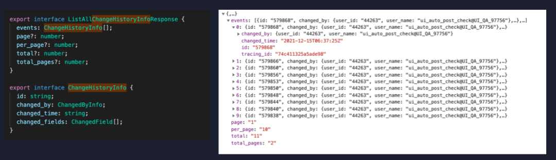 首先是后端接口数据类型,看这个例子,这里定义的 ListAllChangeHistoryInfoResponse 就是后端返回的数据类型,其中每一项的类型是 ChangeHistoryInfo。