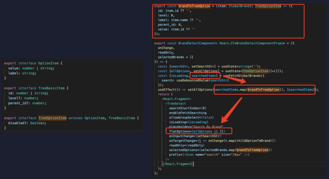还有一类是公共组件或者通用方法的某些参数的类型,从右边的代码中可以看到,这里的 TreeSelect 有一个属性是 flatOptions, 它的类型就是左侧定义的 TreeOptionItem 所组成的 list,我们在项目中一个常见的场景是请求回后端数据,经过一个数据转换的函数,把数据 format 成 option 类型的数据,传给 TreeSelect 做展示。