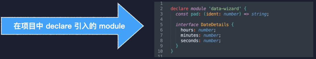 最后回到我们的文件中,由于我们项目的特性,我们并没有大量写.d.ts 文件,但由于我们会需要用到全局声明,通常我们习惯会把全局 declare 放在.d.ts 里。