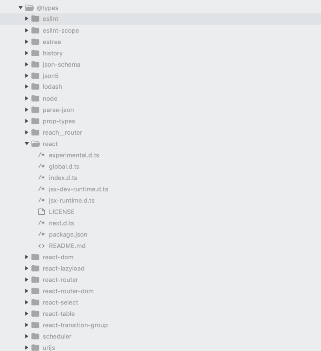 当然还有一种情况,代码不是用 TypeScript 写的,而我们希望调用方可以得到类型信息,这时我们需要手动写.d.ts 来提供一份对外的 type。比如项目中会引入许多第三方库,而这些库是基于 JavaScript 开发的,通常这些库的类型声明文件会放到 node_modules/@type 下。比如这里的 react,就是通过.d.ts 文件来提供类型声明的。