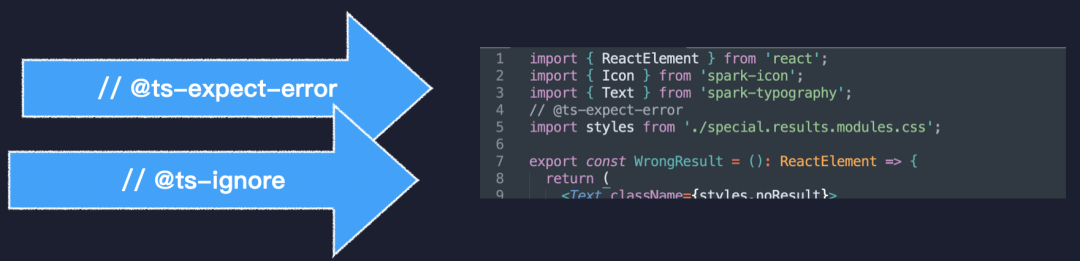 由于这些文件本身无法定义类型,最直接的想法是加上 @ts-except-error,这确实可以解决问题,但是需要注意,如果使用了 ts-expect-error,加下来的代码中没有真实的类型错误,编译器会提示:Unused ‘@ts-expect-error’ directive,而使用 ts-ignore 则无论下面的语句有没有编译错误,编译器都会忽略。