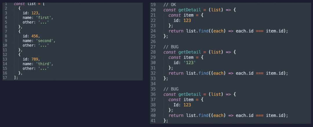 这个 function 功能非常常见,就是从一个 list 中 filter 出某一项。看这三个结果,我期望这里的 item 包含匹配属性 id,且必须是 number 类型,这里的“必须包含以及类型限制”就是一种约束。