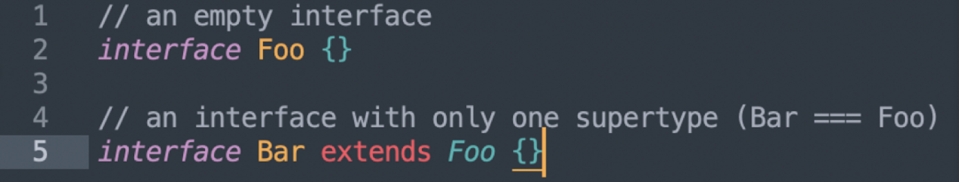 首先是空的 interface, 我们知道在实际代码中定义一个没有任何值的空对象是没有什么意义的,所以相应地也不应该出现这样的类型定义。然后是一个 interface 继承另一个类型后不做任何扩展,这样的写法相当于这两个类型就是完全相等的,也不应该出现这样的写法。