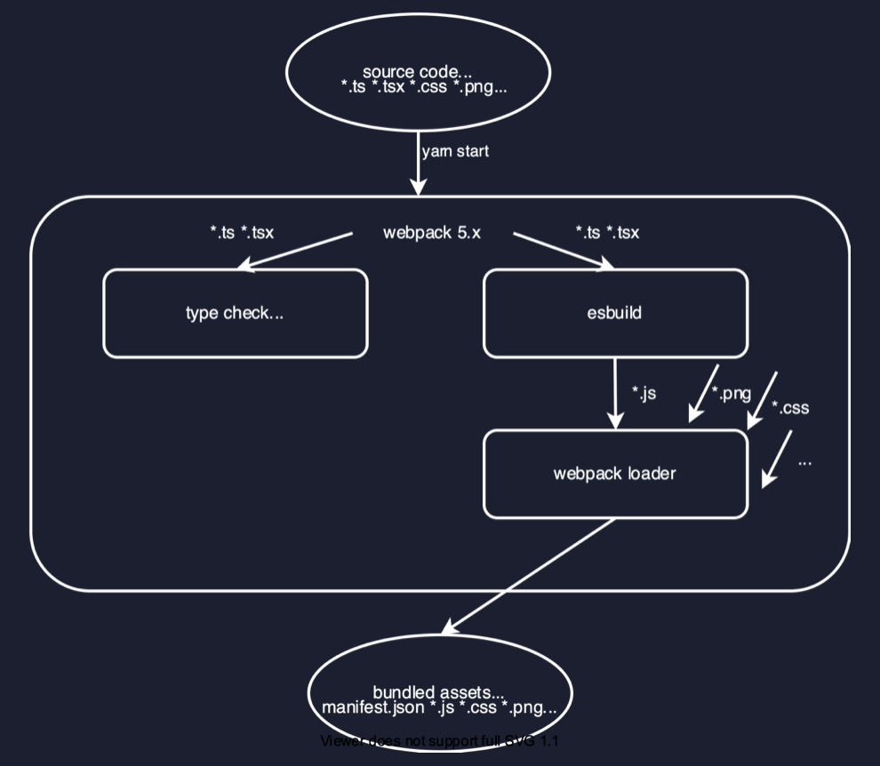 从上面这个图中可以看到,我们项目使用了 webpack5+esbuild 来进行 bundle。在另一个进程中使用插件来进行类型检查,由于是另起进程,所以它不会阻塞主进程的 bundle 过程。