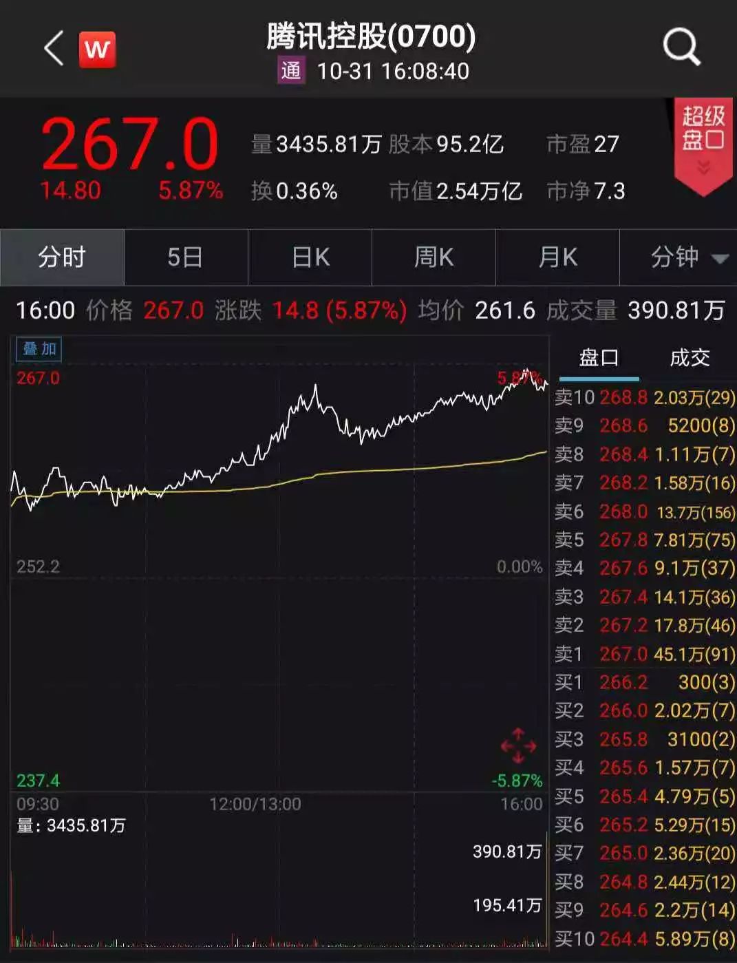 但是在 10 月 31 日,腾讯股价开始反弹,截至收盘,报 267 港元 / 股,上涨 5.87%。