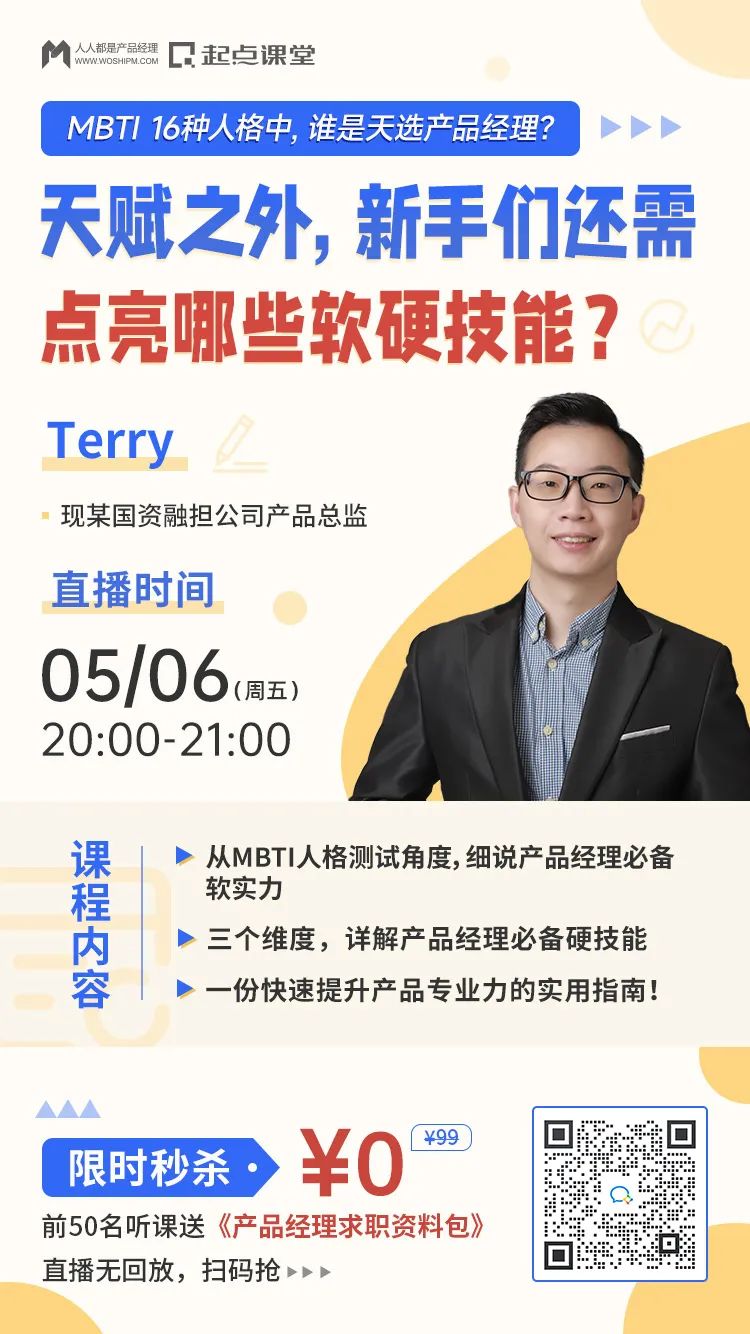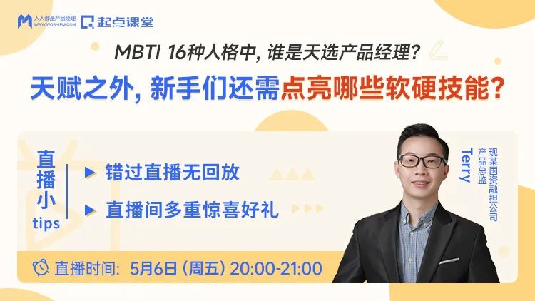 为了帮助产品小白更好的入门,周五晚上8点,人人都是产品经理&起点课堂特邀 现某国资融担集团产品总监、前萨摩耶金服高级产品经理@Terry,作客产品经理入门公开课, 带你从MBTI人格测试角度,细说产品经理必备软实力!