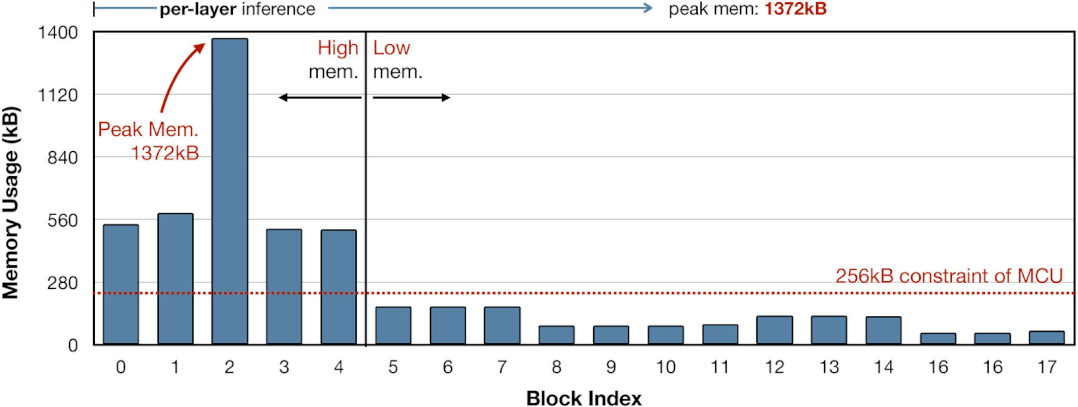 Imbalanced memory distribution 以MobileNetV2为例,上图提供了每个模块的峰值峰值内存占用(注:上述信息通过int8度量得到)。我们可看到非常清晰的内存占用分布不平衡 :前5个模块具有非常大的峰值内存,超出了MCUs内存约束,而其他13个模块则能轻易满足256kB内存约束 。我们同样检查了其他高效网络架构(包含针对MCU而设计的MCUNet)并发现了类似的现象。