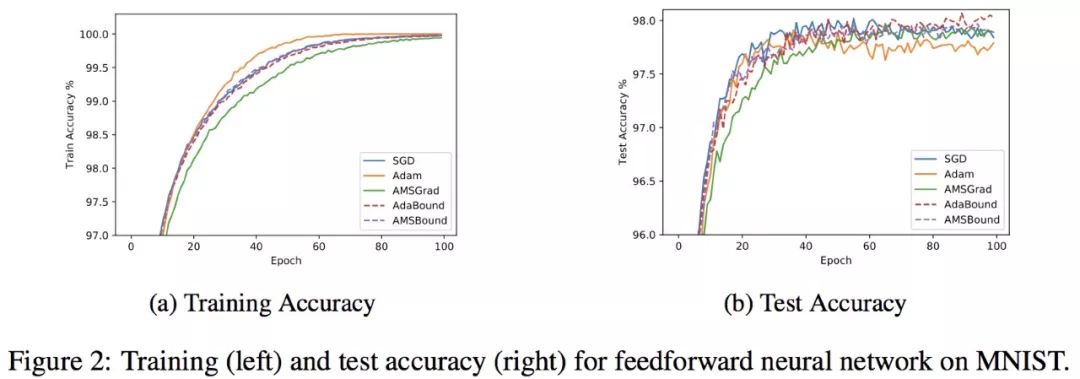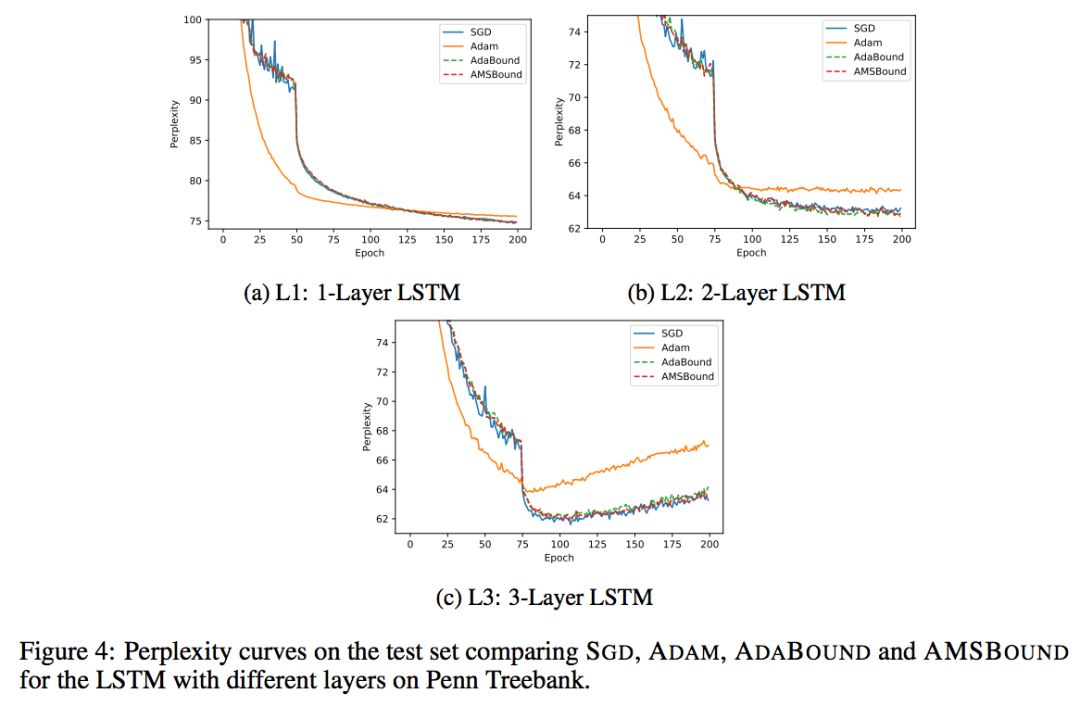 作者将 AdaBound/AMSBound 和其他经典的学习器在一些 benchmarks 上进行了实验验证,包括:SGD (或 momentum 变种)、AdaGrad、Adam、AMSGrad。以下是作者在论文中提供的学习曲线。