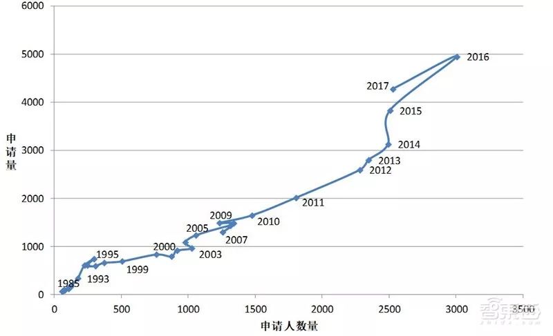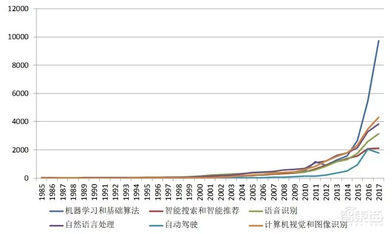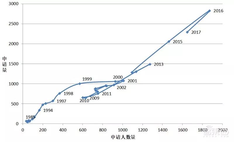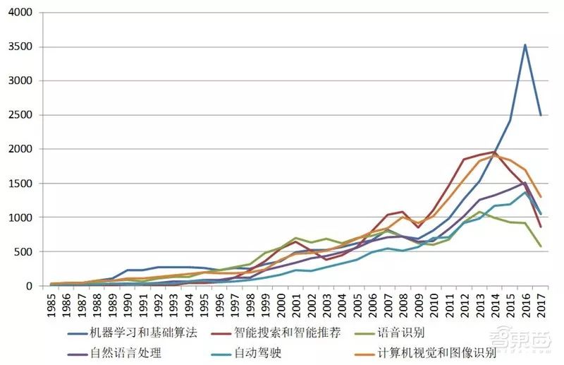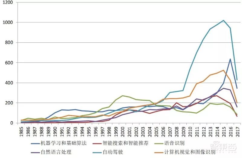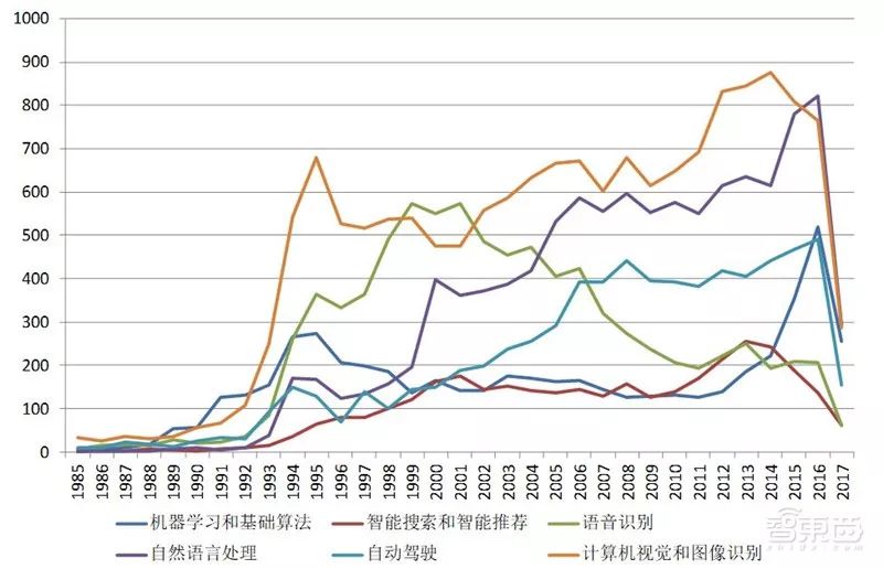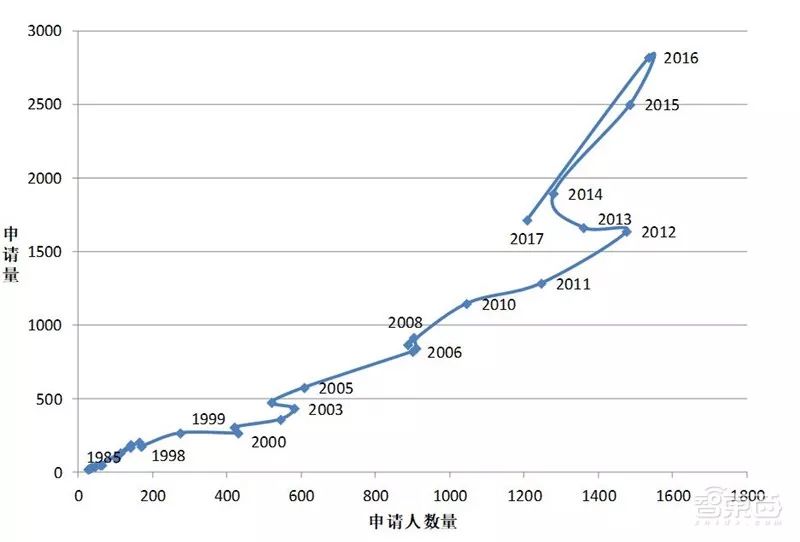 机器学习和基础算法这一技术分支在1985后一直处于缓慢的增长中,仅在1999、2000年左右有过短暂的技术活跃期,在熬过近十年的技术停滞期后,终于在2009年之后迎来了一次快速的发展。而近几年则慢慢出现了技术成熟期的特点:2014-2015年间申请人数量几乎不变,2015-2016年间申请人数量的增长低于申请量的增长,2016年的申请量比2015年的申请量翻了一番还多,2017年申请量增长的速度有所下降,而申请人数量大幅度下降。