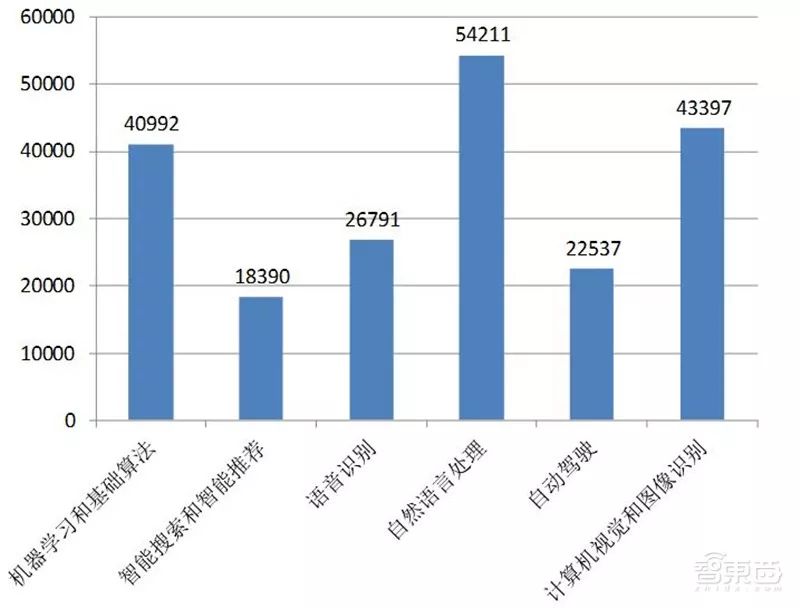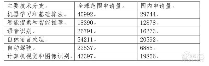 作为研究对象的技术分支包括:机器学习和基础算法、智能搜索和智能推荐、语音识别、自然语言处理、自动驾驶及计算机视觉和图像识别。以上六个技术分支在全球范围和国内的专利申请量分别如下表所示。
