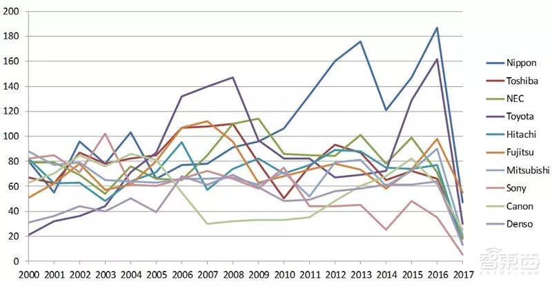 日本的申请量变化趋势在几个国家和地区中最为复杂,且除了个别公司,如Nippon,Toyota之外,其他几个公司找不到明显的具有上升趋势的申请态势,申请量反而从2000年之后一直处于剧烈的波动状态,甚至索尼公司的申请量一直在逐年走低。而这些专利权人的申请量在2017年基本上都有了一定程度的回落,可能是由于部分2017年的专利申请未公开的情况造成。