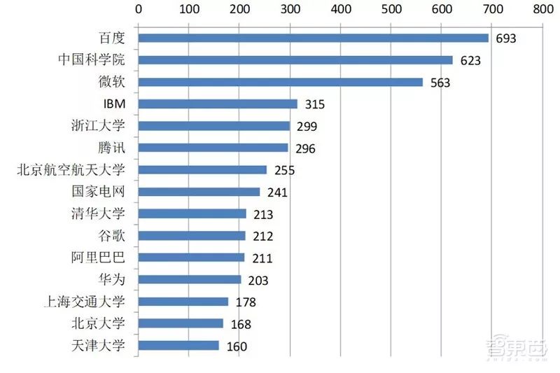 在自然语言处理这一技术分支上,前15位中企业申请人和科研机构申请人分别占据半壁江山。排名前三的百度、中国科学院和微软的申请量总体较为突出。IBM的排名在这一领域达到了比较靠前的位置。在科研机构申请人中,除在各个领域均位列前茅的中国科学院外,浙江大学的表现也令人印象深刻,在自然语言处理方向位列第五,而在机器学习和基础算法方向则达到第三位。