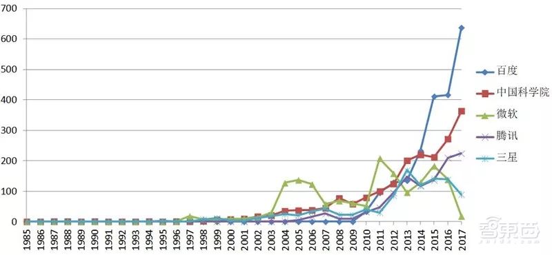 在我国国内各公司的申请量趋势非常一致,保持了一个平稳的持续增长的速度,而其中,百度和中国科学院的申请量在2013年之后增长远超其他专利权人,其中又以百度为首,其申请量增速在2013年之后有了飞跃的提升。而其中各个专利权人在2017年的申请量有了分化,其中属于国外的公司的申请量均有所下降,很大的原因是因为2017年的申请还有很多没有公开,因而无法体现在数据中,但是中国本土的公司、高校和科研院所的申请量不降反升,这其中,一部分原因可能是国内的这些专利权利人的申请量进一步增加,另一部分也和国内现在很多专利权人要求提前公开、进入优先审查流程等快速通道有关。