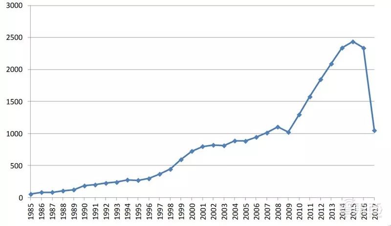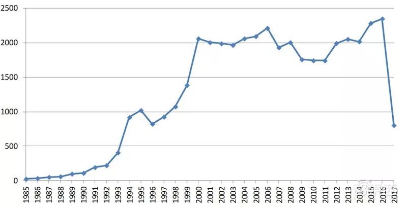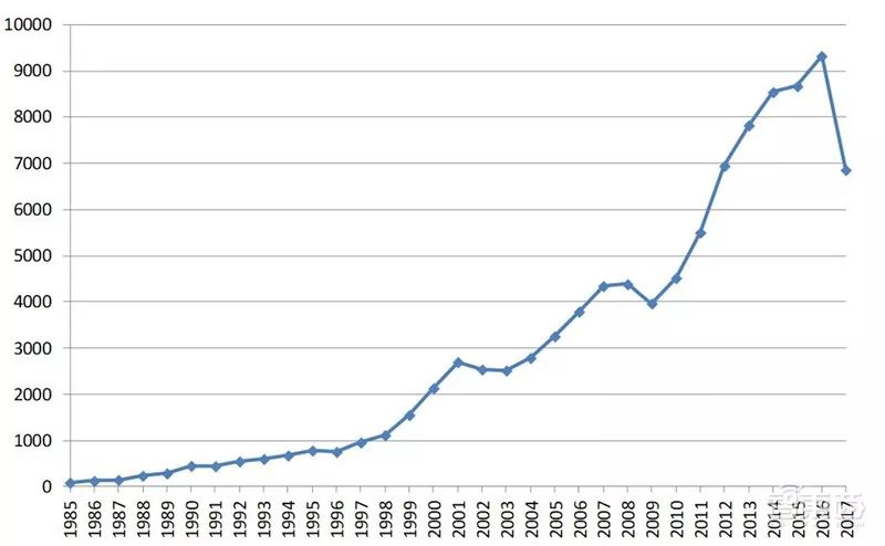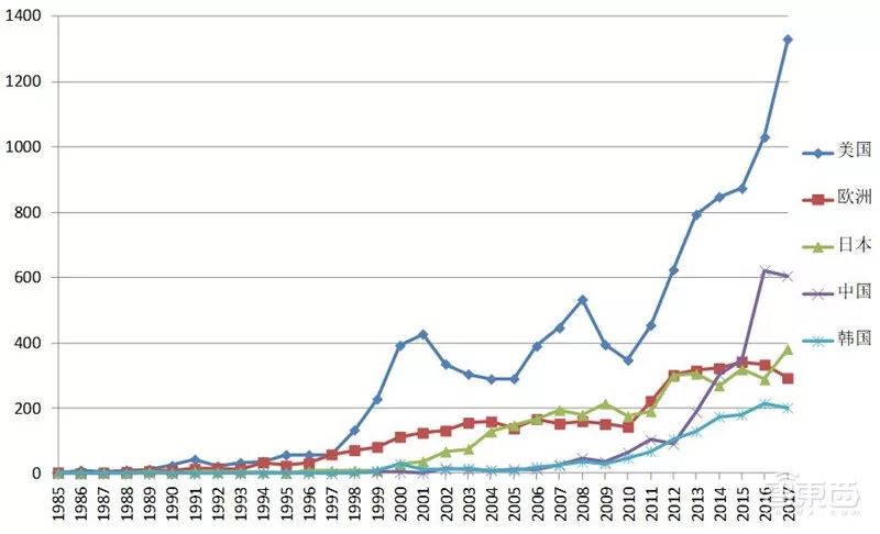 美国申请量整体呈现平稳上升的趋势,在2010年之后有过一段迅速增长的时期,最近两年的增长速度稍微放缓,2017年的申请量下降可能是由于部分2017年的专利申请未公开的情况造成。
