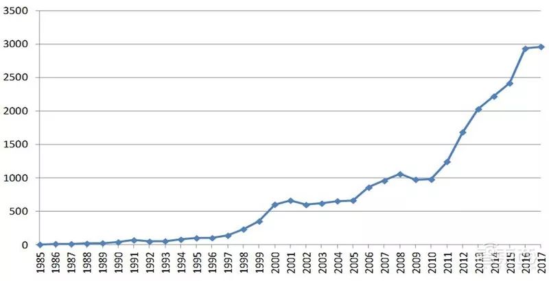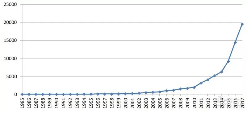 下图揭示了从1985年至2017年各年度的申请量变化情况。全球范围内,人工智能领域的专利申请量总体上呈逐年上升趋势,在2010年后增长速度明显加快,近两年的增长率更是令人瞩目。由此可见,人工智能领域已经成为世界各国的研发热点,正在迎来全面的技术进步。