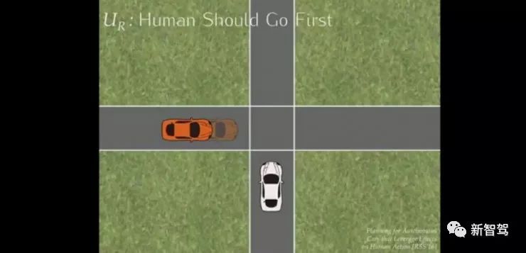 Anca称她最喜欢的一个例子是,仍然是四面停止标志的十字路口,当处于僵持、没有乘客的无人车(橙色)需要表示“你先走”的时候,无人车会稍稍后退,在这个路口中,人类司机同样在进行效率和安全的博弈,而当无人车后退的时候,车辆相撞的几率变小,此时人类司机就会通过路口,达到人类车辆效用函数的最大化。
