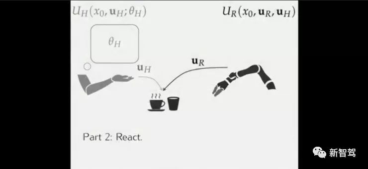 在这个例子中,这是一个保证效率和安全的博弈。人类的参数是隐藏的,我们通过反向优化控制来猜测这些数据,机器人收集这些展示人们将如何与机器人互动的数据,设置一个最大似然观察,然后机器人去解决这个嵌套优化问题,即当人不可避免地受到我所做的事情的影响时,我该怎么做才能最大限度地将我的效用最大化?最终会达到人和机器人的和谐协作。