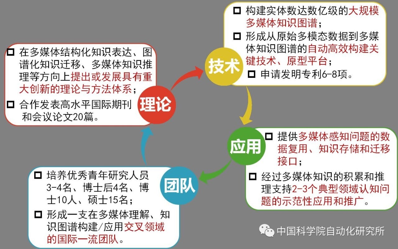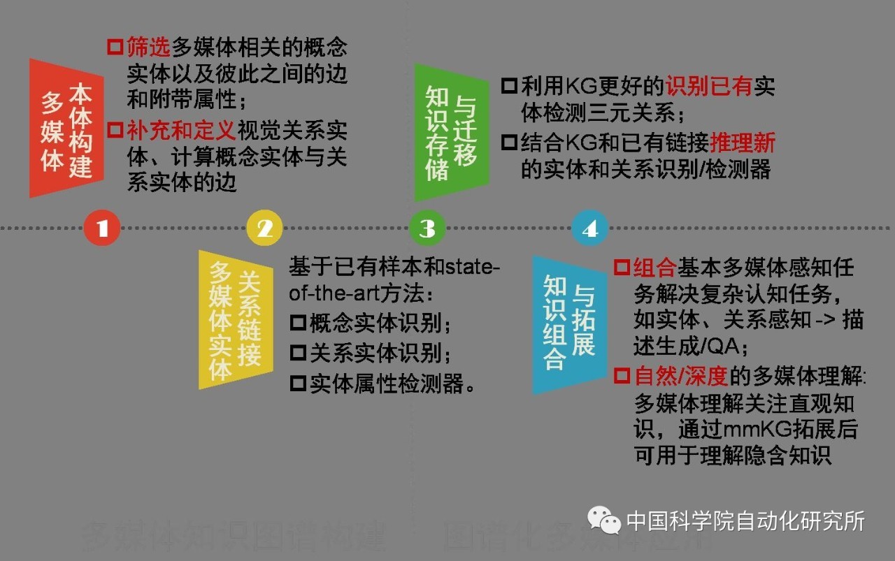 一是跨媒体知识图谱构建,研究跨媒体实体和关系表达学习、跨媒体知识关联和图谱构建。二是图谱化跨媒体推理应用,基于知识图谱的跨媒体知识迁移和复用、基于知识图谱的跨媒体推理,实现基于知识图谱的跨媒体推理和智能演化,解决跨媒体认知复杂问题。