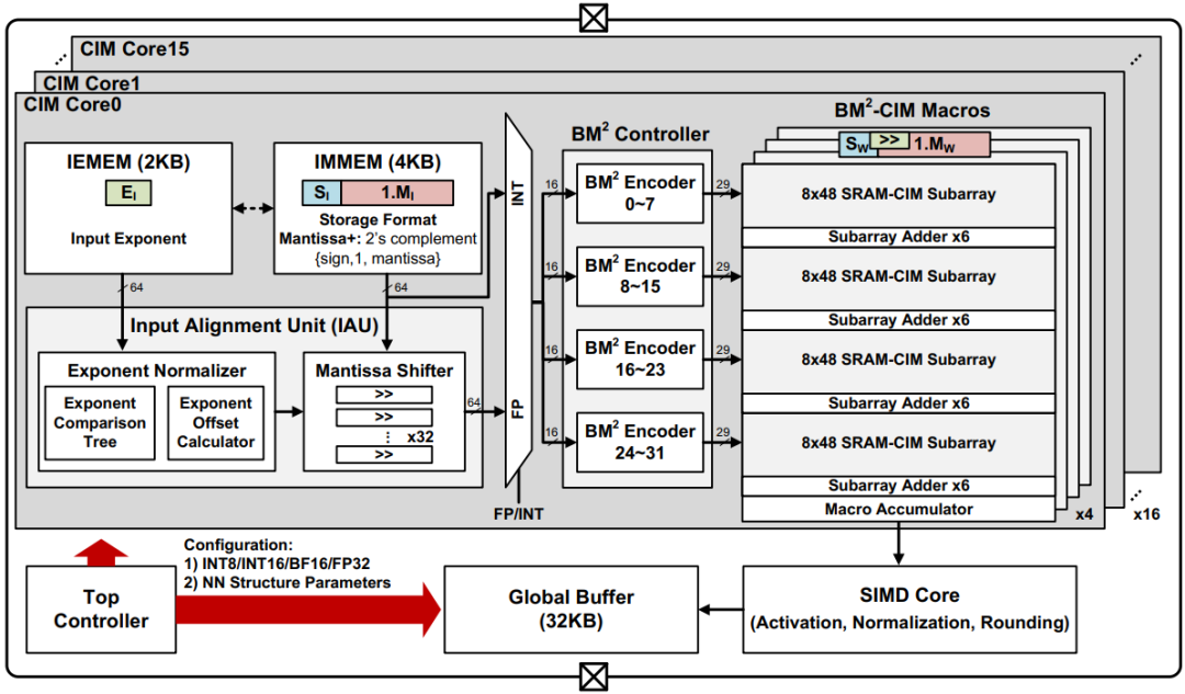 3) ReDCIM采用层次化可重构存内累加架构,在同一个CIM单元内灵活支持多种浮点(BF16、FP32)和整数(INT8、INT16)计算能力,满足云端AI计算需求。