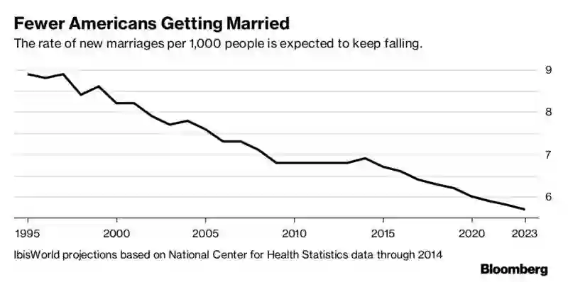 美国的结婚率,每千人中新婚人士所占的比例,已经连续数年下滑。在2008年和2009年的经济大萧条时期,结婚率的下滑尤为明显,但是即便经济恢复过来,也没有证据显示人们重拾了对婚姻的兴趣。研究机构IbisWorld预计,在未来五年内,结婚率将会持续下降。