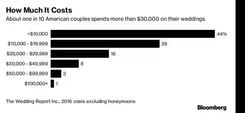 根据Wedding Report的调查,2016年一场婚礼的平均花销为26720美元,较之2015年仅上涨了0.3%,而且这个平均数受到了少数极为奢华的婚礼的影响,一场婚礼花销的中位数为14399美元。