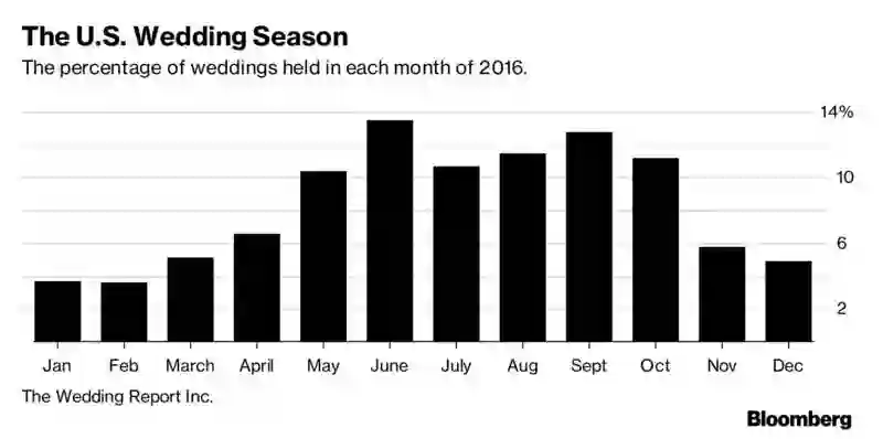 美国结婚季:2016年各个月举行的婚礼数量占年总量的比例