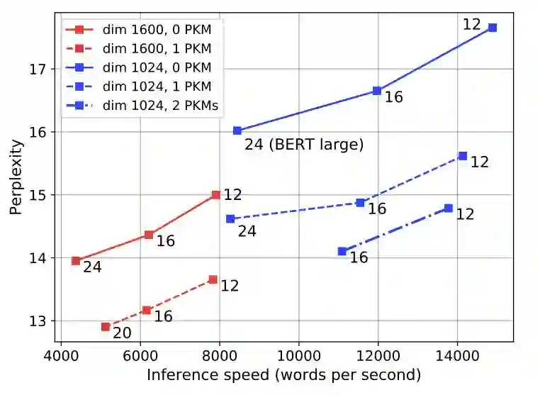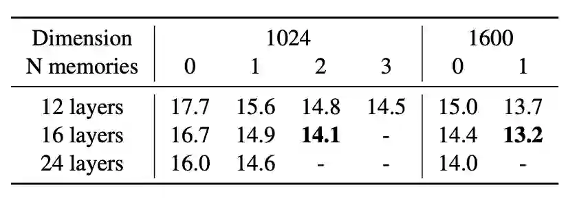 添加2或3个存储层进一步提高了性能。特别是,当内部隐藏状态具有1600维时,具有12层和存储器的模型比具有24层(与BERT large的配置相同)的模型获得更好的困惑,速度几乎快了两倍。将内存添加到内部维度等于1600的large型模型时,推理时间几乎不会增加。