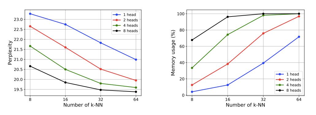 上图显示增加head数或k-NN数。可以改善模型的复杂性和内存使用。