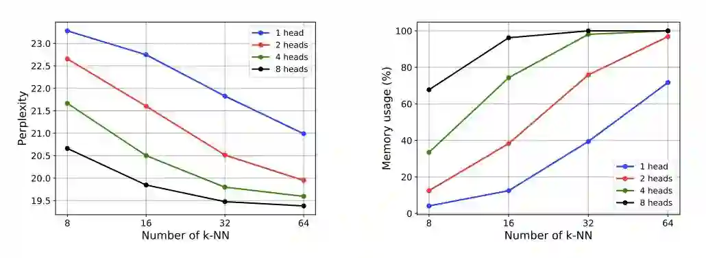 研究人员还注意到。具有相同h×k(h是head数,k是最近邻数)的模型具有相似的内存使用。比如,(h, k) ∈ {(1, 64),(2, 32),(4, 16),(8, 8)}所有内存使用率约为70%,困惑度约为20.5。