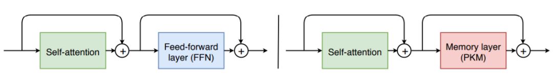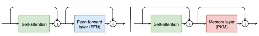 图3:左:典型的transformer模块由自注意力层和FFN层(双层网络)组成。右图:在我们的系统用product存储器层替换了FFN层,这类似于具有非常大的隐藏状态的稀疏FFN层。在实践中,我们仅替换N层FFN层,其中N∈{0,1,2}