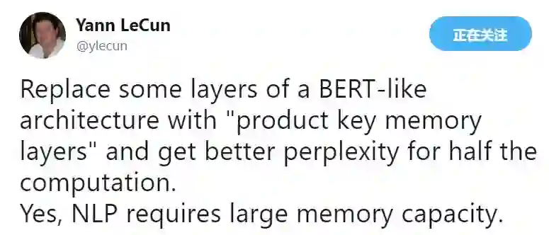 图灵奖得主,AI大神Yann LeCun发Twitter推荐。LeCun认为,本文用product key memory层替代了BERT模型中的结构层,实现了与后者相当的性能,计算量降低了一半。