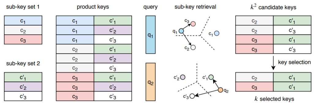 图2:product key示意图。我们定义了两个离散的密钥子集(子密钥集1和子密钥集2)。它们会产生更大的密钥集,这些密钥永远不会明文表示。对于给定的查询,我们将其分为两个子查询(q1和q2)。在每个子集中选择k个最接近的密钥(图中的k = 2),从而隐含地选择k×k个密钥。保证使用查询最大化内积的k个key属于该子集,在该子集上可以更高效地进行搜索。