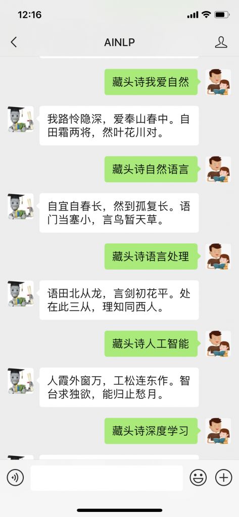 请注意这两个功能目前只提供'五言绝句'的生成,因为上述代码在训练模型的时候已经过滤了其他诗词,另外这套代码也用了一些trick,生成的结果也是随机的,每次都不一样。最后,感兴趣的同学欢迎关注AINLP公众号,直接在公众号对话里测试即可: